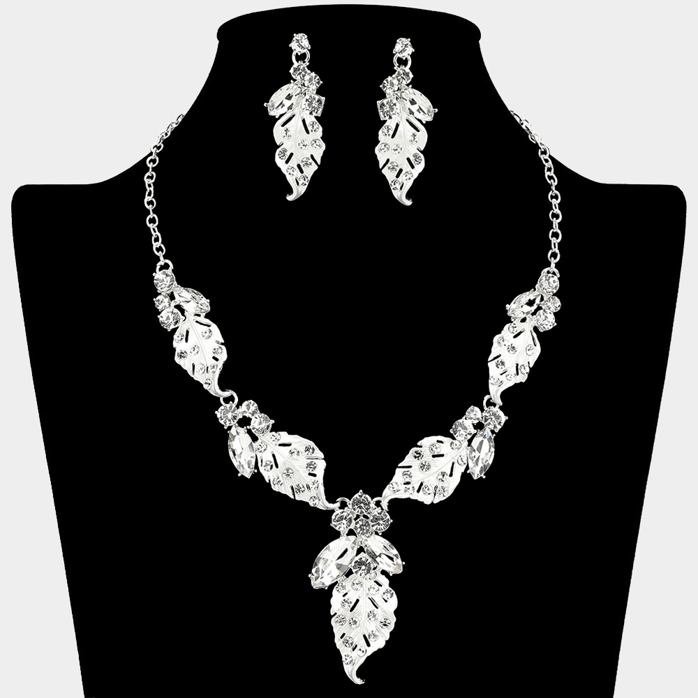 Marquise Round Stone Cluster Colored Metal Leaf Embellished Necklace