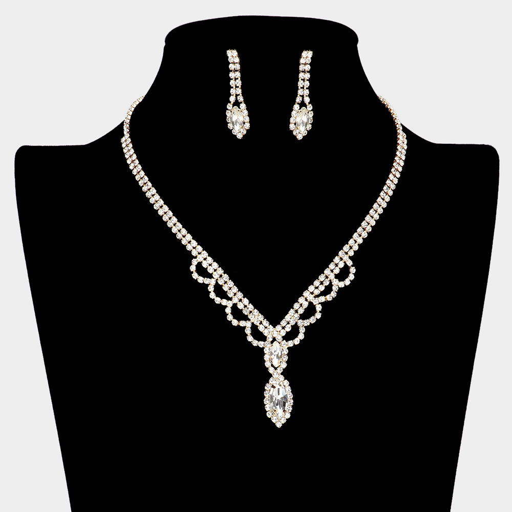 • Shine with elegance in this draped crystal necklace and earring set. Perfect for weddings, parties, and special occasions, this jewelry set features a refined cascading design that adds sparkle and sophistication to any formal look.