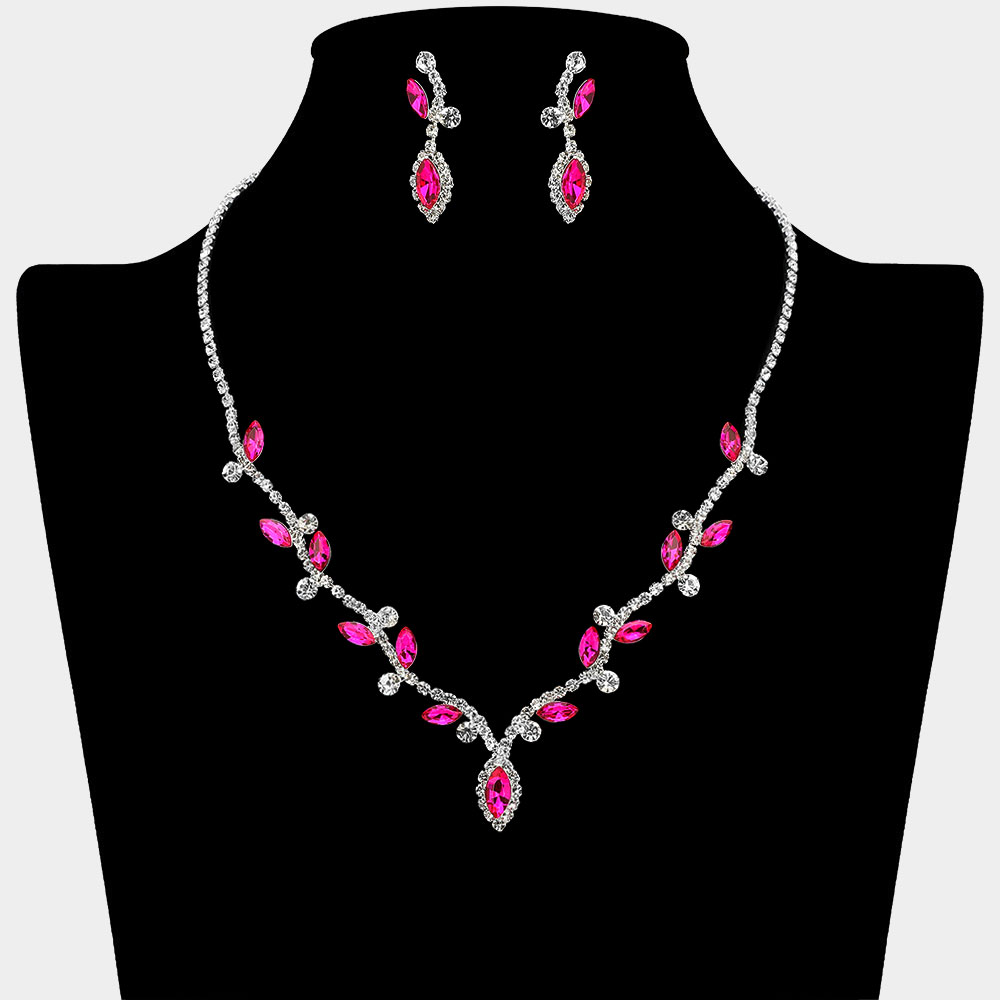 Details • Necklace Size : 15" + 4" L • Decor Size : 08" L • Earring Size : 1.4" L • Elegant jewelry set featuring a rhinestone necklace with marquise-cut leaf accents and matching drop earrings. Perfect for weddings, proms, and formal occasions. Adds graceful sparkle and charm to any outfit. • Lead and Nickel Compliant