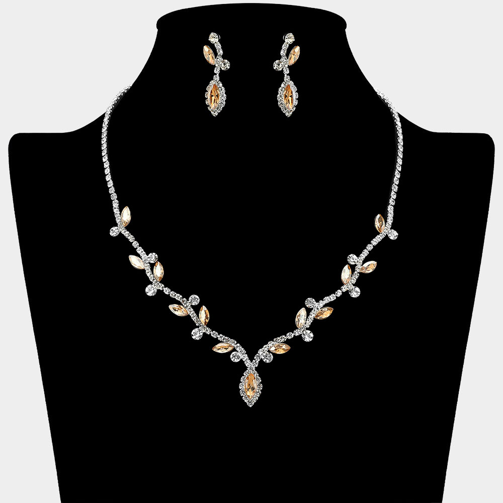 Details • Necklace Size : 15" + 4" L • Decor Size : 08" L • Earring Size : 1.4" L • Elegant jewelry set featuring a rhinestone necklace with marquise-cut leaf accents and matching drop earrings. Perfect for weddings, proms, and formal occasions. Adds graceful sparkle and charm to any outfit. • Lead and Nickel Compliant