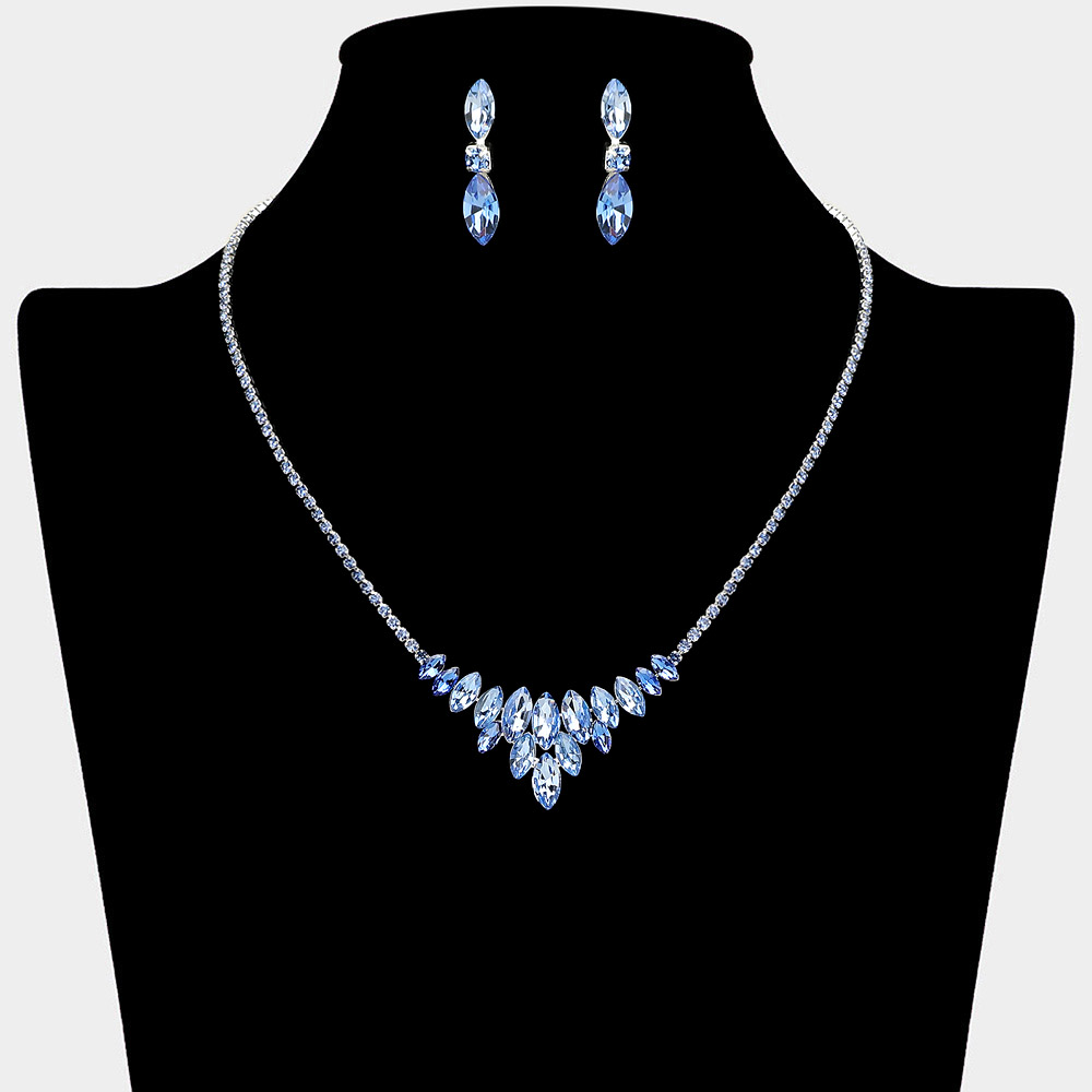 • Elegant marquise cut rhinestone statement set featuring a dramatic V-shaped drop necklace constructed from cascading stones and a delicate line chain. The sophisticated necklace pairs perfectly with the included dangle earrings. Ideal accessories for brides, proms, galas, and formal events. This stunning set makes a bold and dazzling style statement.
