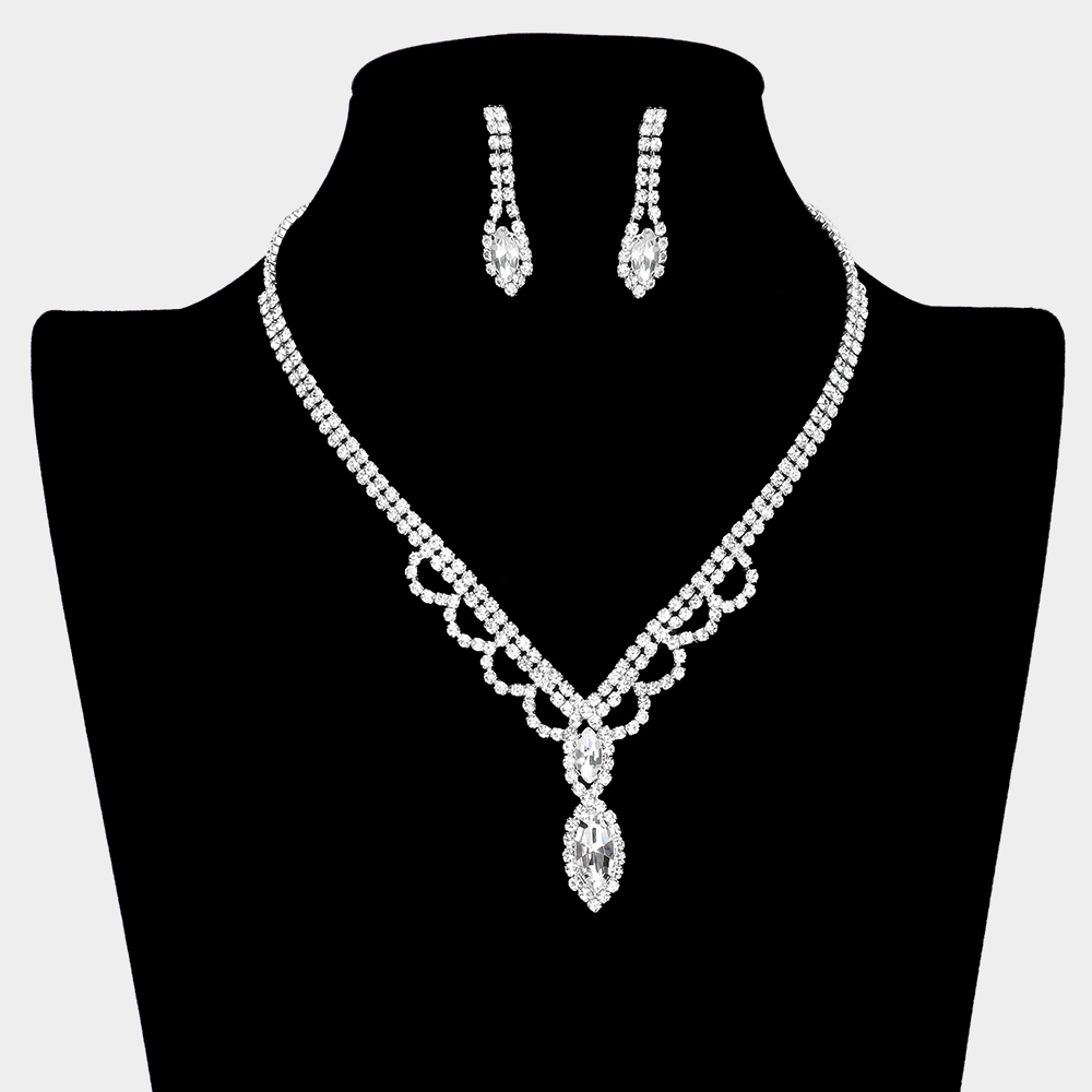 • Shine with this rhinestone marquise pendant necklace and earrings set, designed with a delicate scalloped chain and sparkling marquise drop. Perfect for weddings, proms, and elegant occasions, this timeless jewelry set brings sophistication and brilliance to complete your evening look.