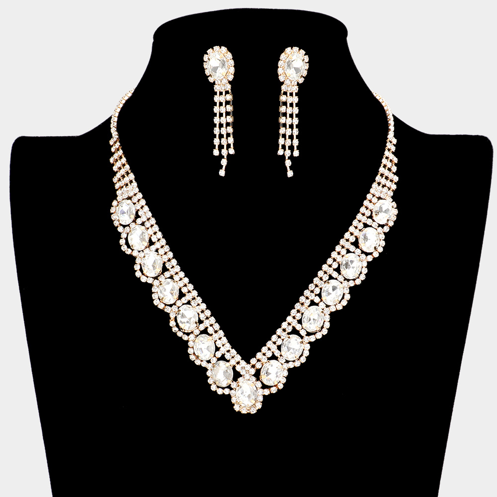 Oval Stone Accented V Shaped Rhinestone Necklace