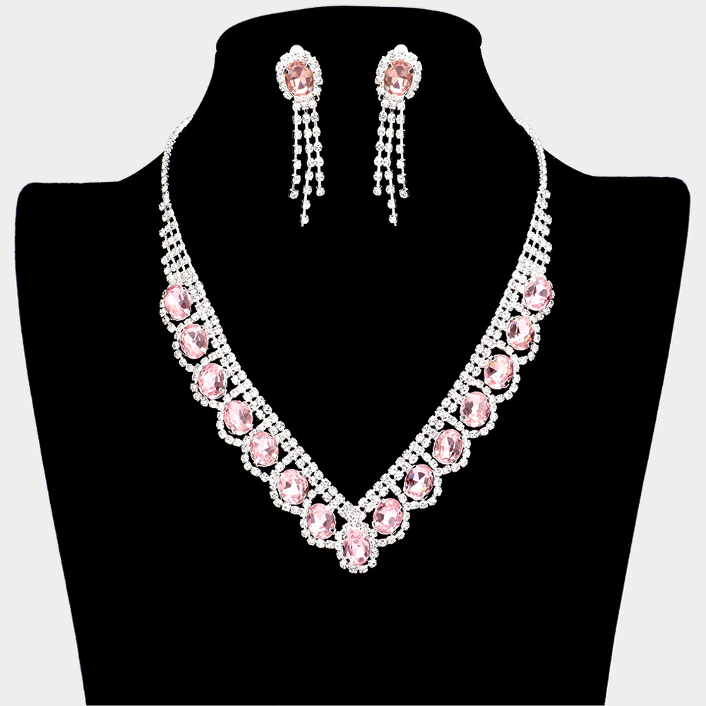 Oval Stone Accented V Shaped Rhinestone Necklace Clip on Earring Set