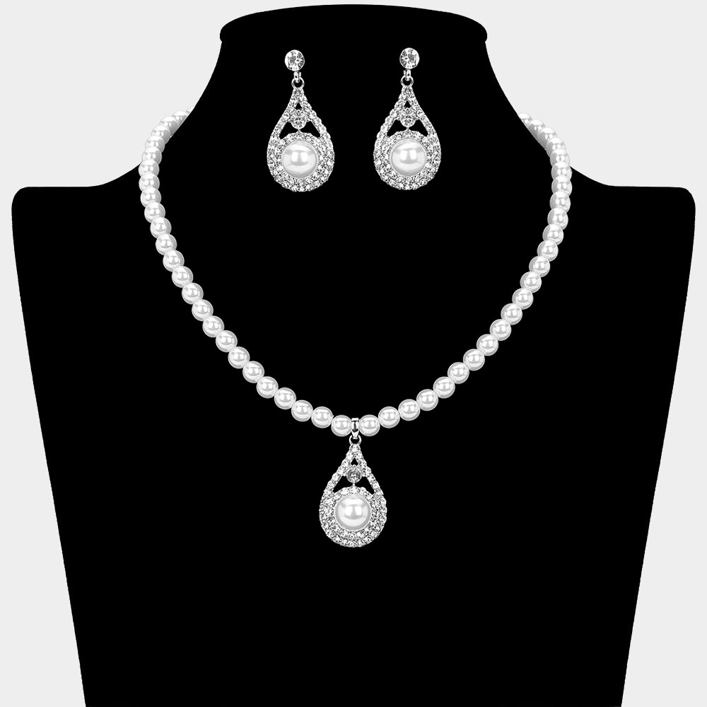 Pearl Accent Rhinestone Paved Teardrop Pendant Pearl Necklace