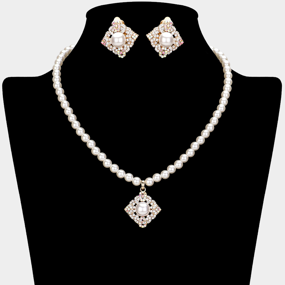 Pearl Centered Stone Paved Pendant Pointed Necklace