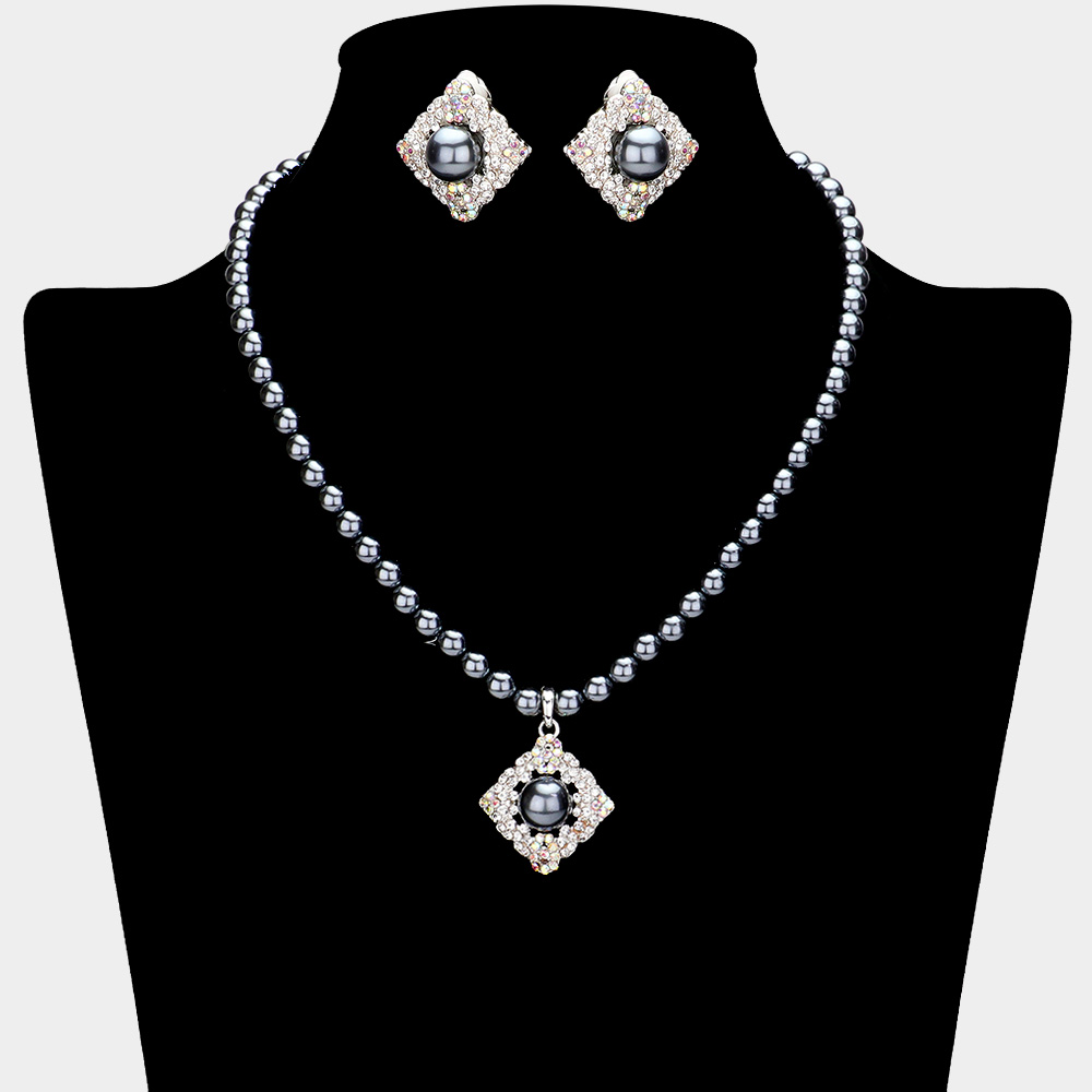 Pearl Centered Stone Paved Pendant Pointed Necklace