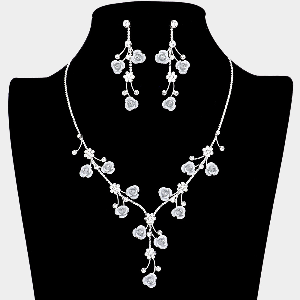 Details • Necklace Size : 14.5" + 4" L • Decor Size : 2" L • Earring Size : 2.25" L • Elevate your look with this elegant floral necklace and earring set. Featuring delicate flower accents and a graceful design, this jewelry set adds a refined charm to both special occasions and everyday wear, making it a must-have accessory for timeless sophistication.