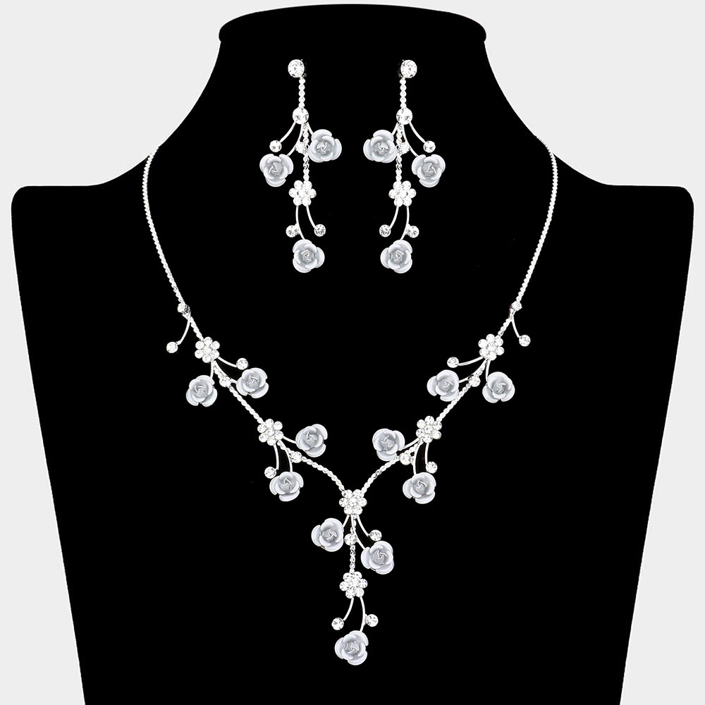 • Elevate your look with this elegant floral necklace and earring set. Featuring delicate flower accents and a graceful design, this jewelry set adds a refined charm to both special occasions and everyday wear, making it a must-have accessory for timeless sophistication.