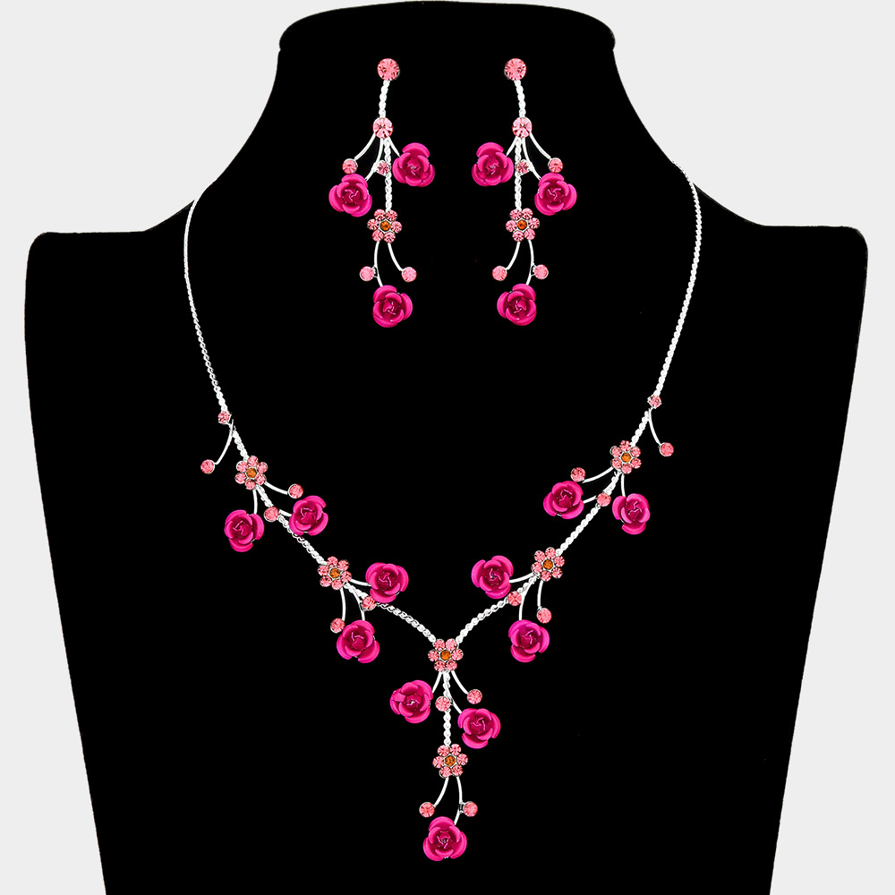 Rhinestone Embellished Rose Flower Cluster Vine Necklace