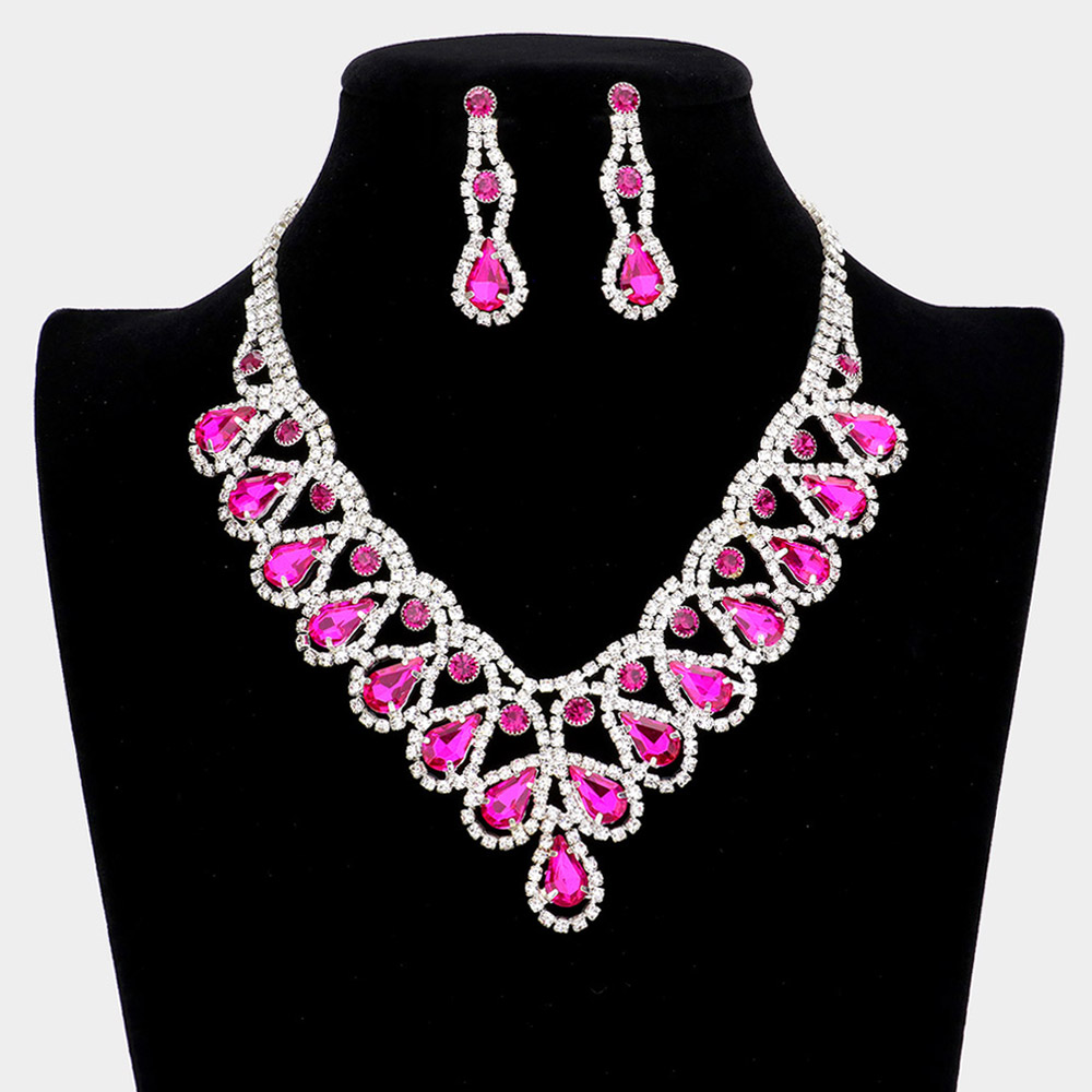 Rhinestone Pave Crystal Teardrop Detail Fringe Necklace