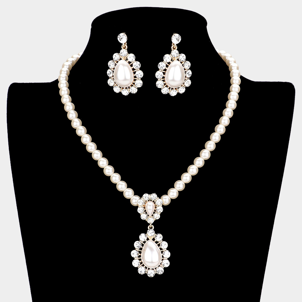 Details • Necklace Size : 15.5" + 3" L • Pendant Size : 0.9" x 2" • Earring Size : 1.6" L • Make a dazzling impression with this glamorous pearl and crystal teardrop necklace set. Featuring a radiant pendant and matching earrings, this elegant jewelry ensemble adds timeless sophistication and sparkle, ideal for weddings, galas, or special evening occasions.