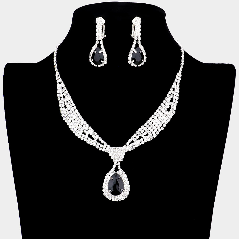 Rhinestone Pave Teardrop Collar Necklace & Clip Earring Set