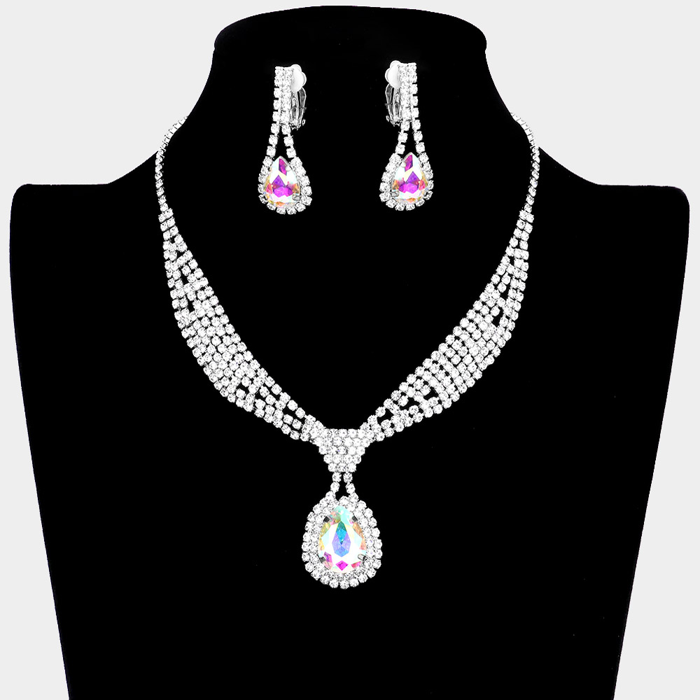 Rhinestone Pave Teardrop Collar Necklace & Clip Earring Set