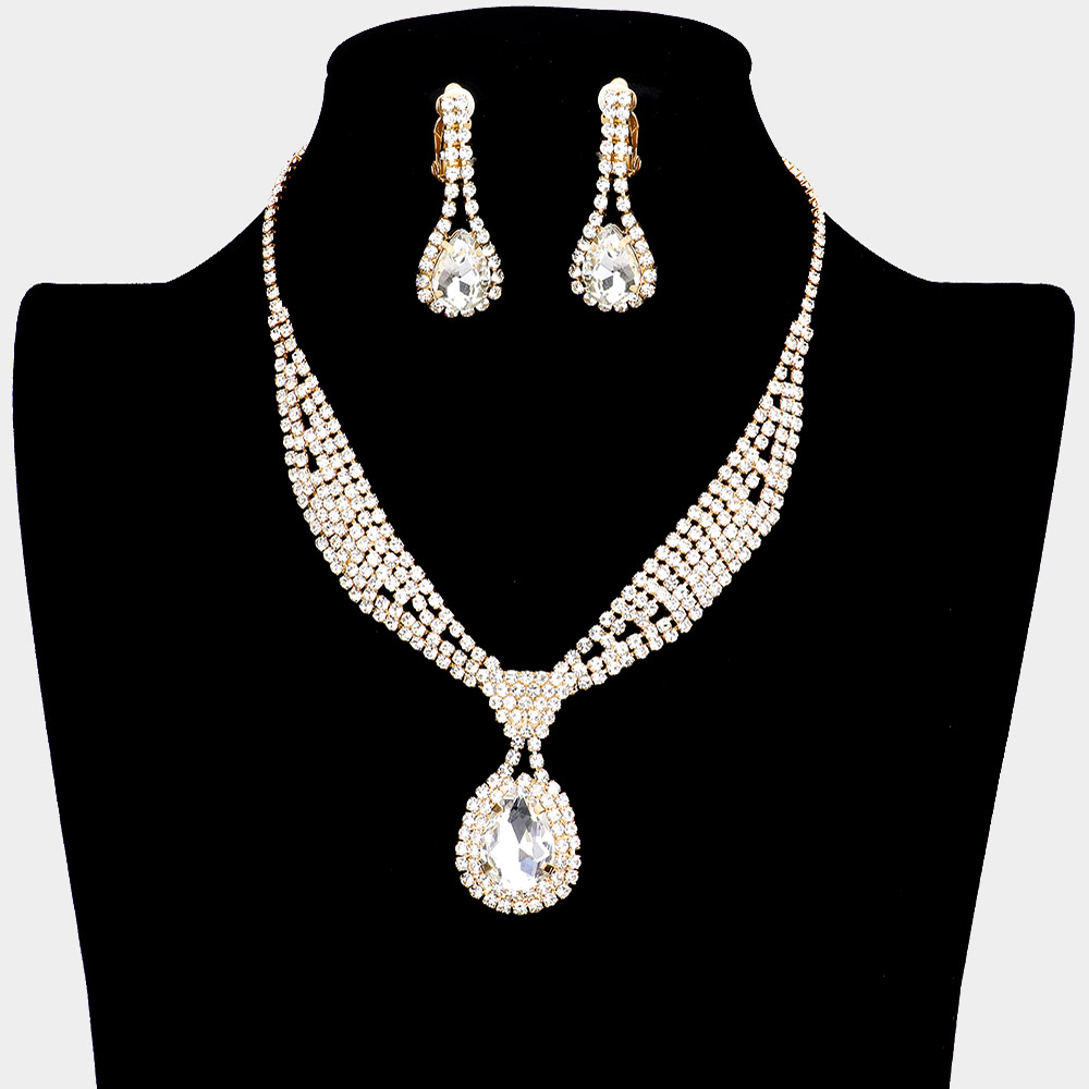 Rhinestone Pave Teardrop Collar Necklace & Clip Earring Set