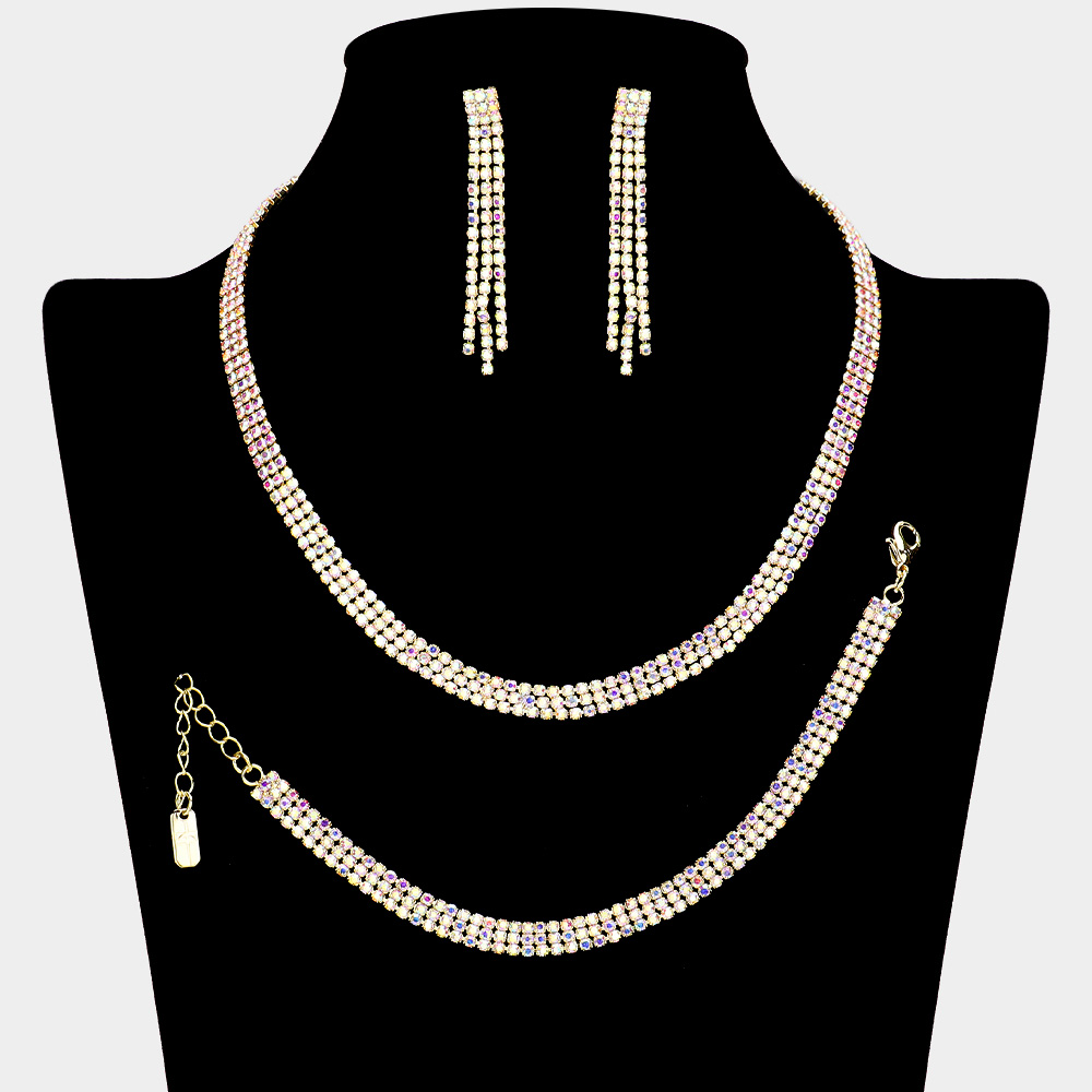 Rhinestone Paved 3-Row Necklace Jewelry Set