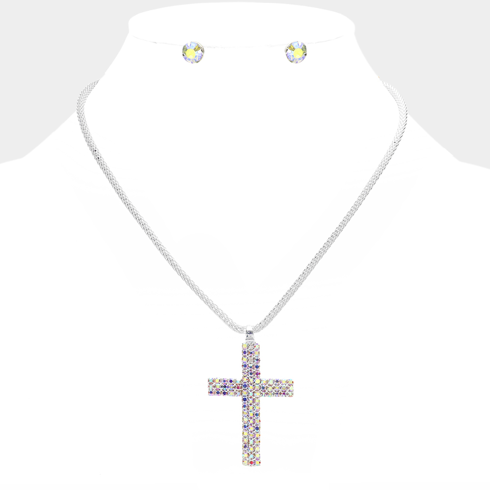 Iridescent Heart Stone Centered Ornate Cross Dangle Earrings