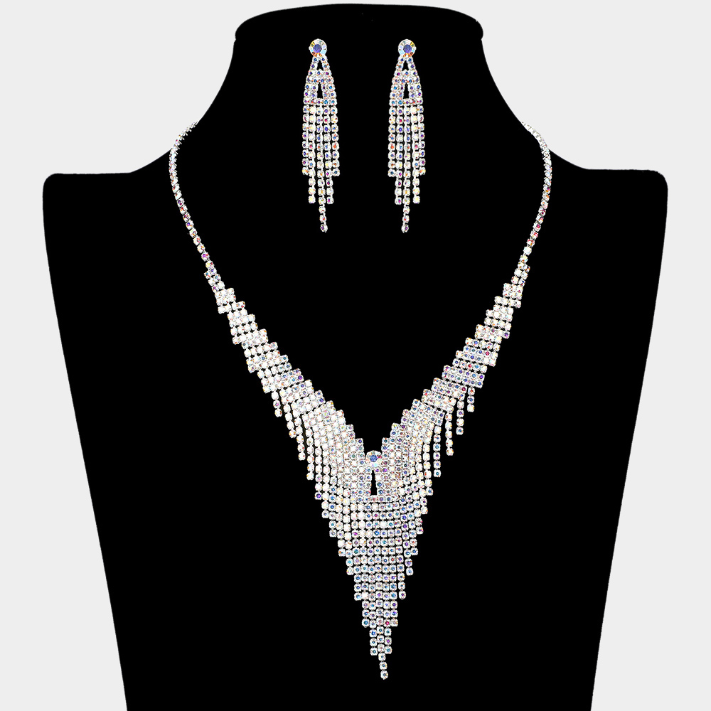 Rhinestone Pave Crystal Teardrop Detail Fringe Necklace