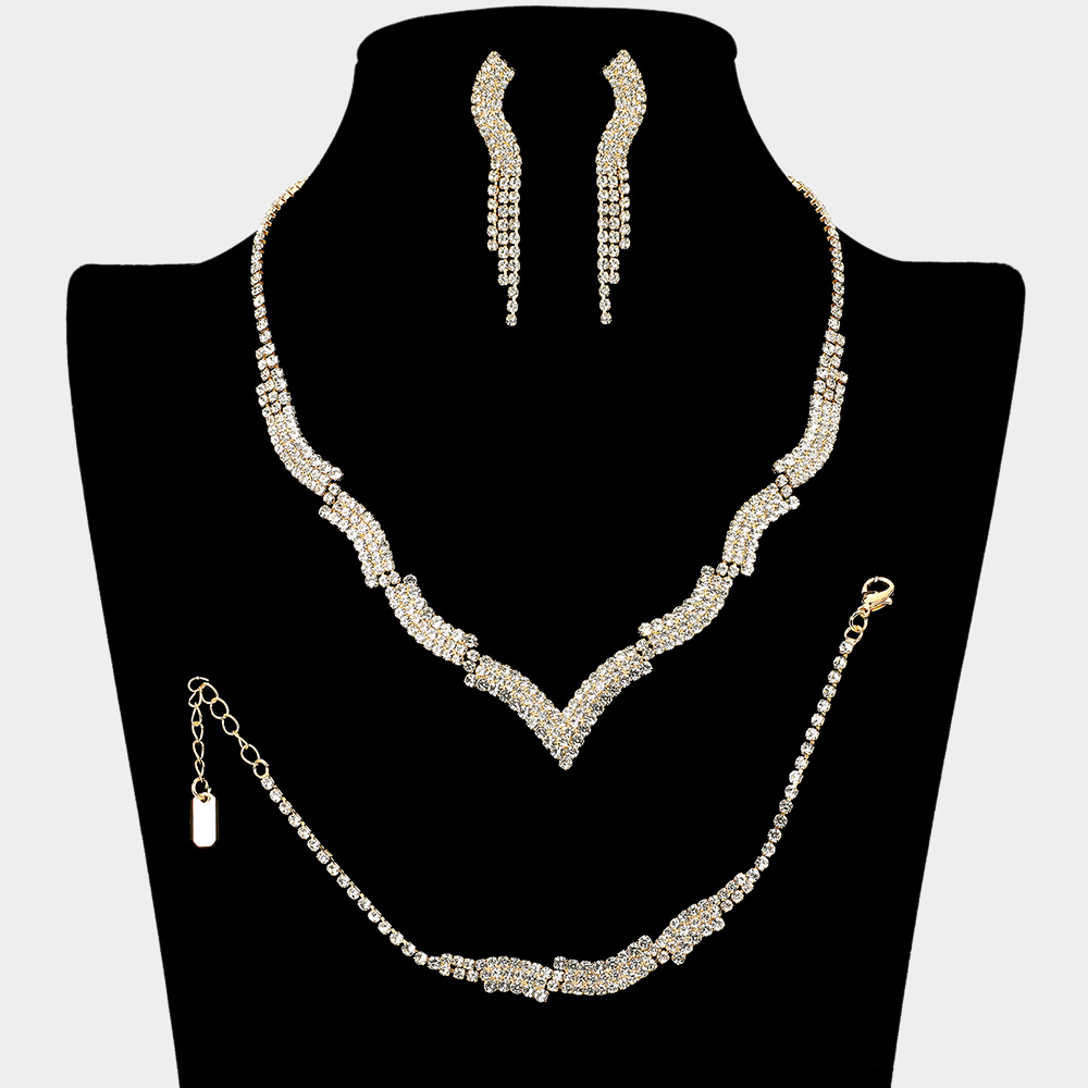 Rhinestone Paved X Pointed Plate Snake Chain Necklace Jewelry Set