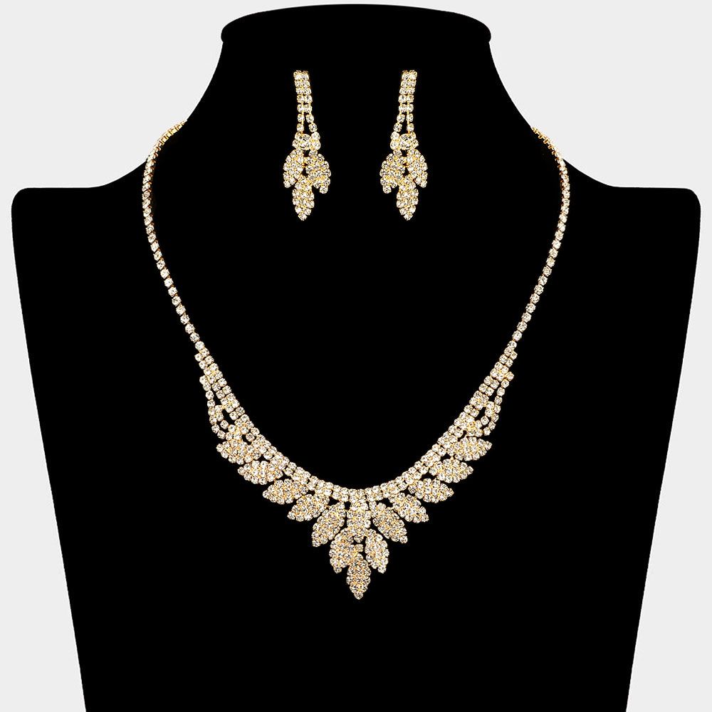 Details • Necklace Size : 16" + 4" L • Decor Size : 1.25"L • Earrings Size : 1.6" L • Shine with refined elegance in this crystal leaf necklace and earring set. Designed with intricate leaf patterns and brilliant stones, it brings a graceful sparkle to any look. Perfect for weddings, parties, or formal occasions, this set adds timeless sophistication and charm.