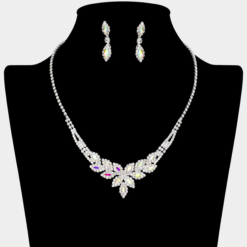 Flower Accented Marquise Stone Cluster Evening Necklace