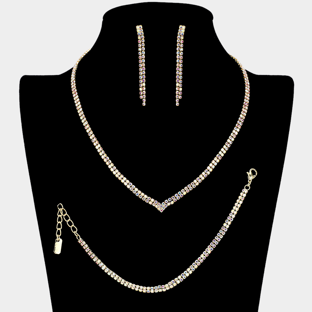 Details • Necklace Size : 16" + 4.25" L • Decor Size : 0.25" L • Bracelet Size : 0.2" H, 7" +1.8" L • Earrings Size : 2.2" L • Complete your elegant look with this 3-piece jewelry set featuring a rhinestone necklace, matching bracelet, and drop earrings. A radiant choice for formal events, evening parties, or special occasions.
