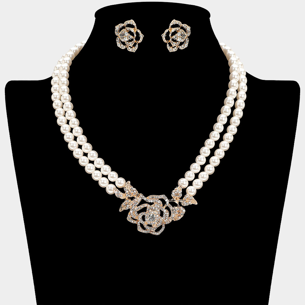Rhinestone Paved Rose Pendant Double Layered Pearl Necklace