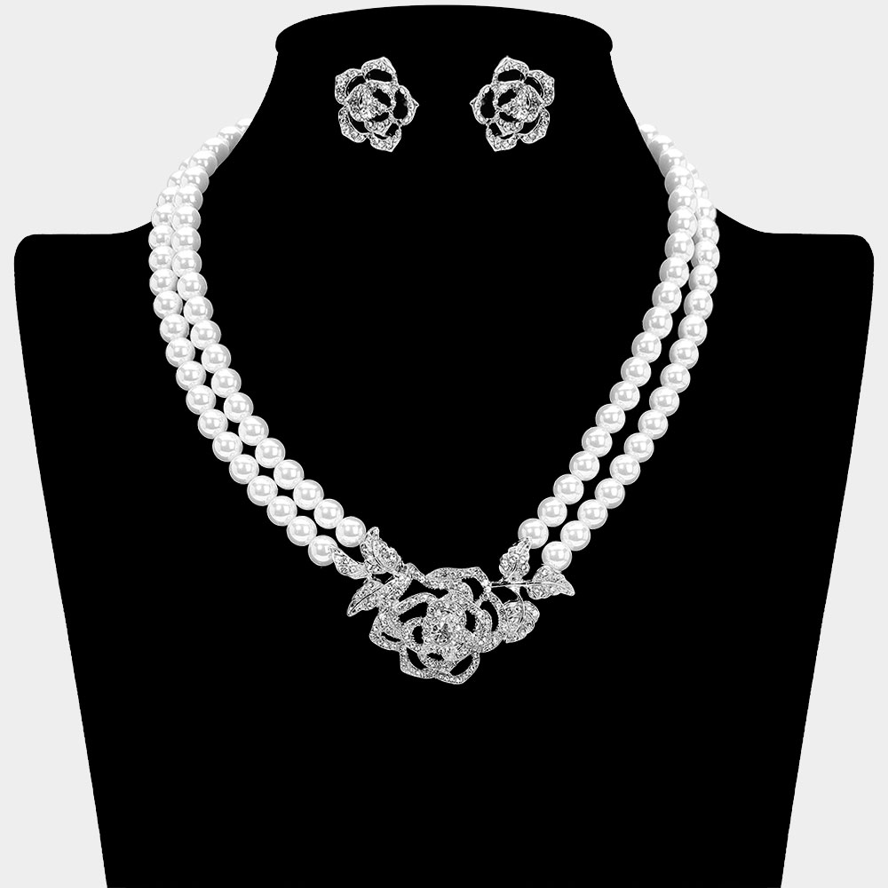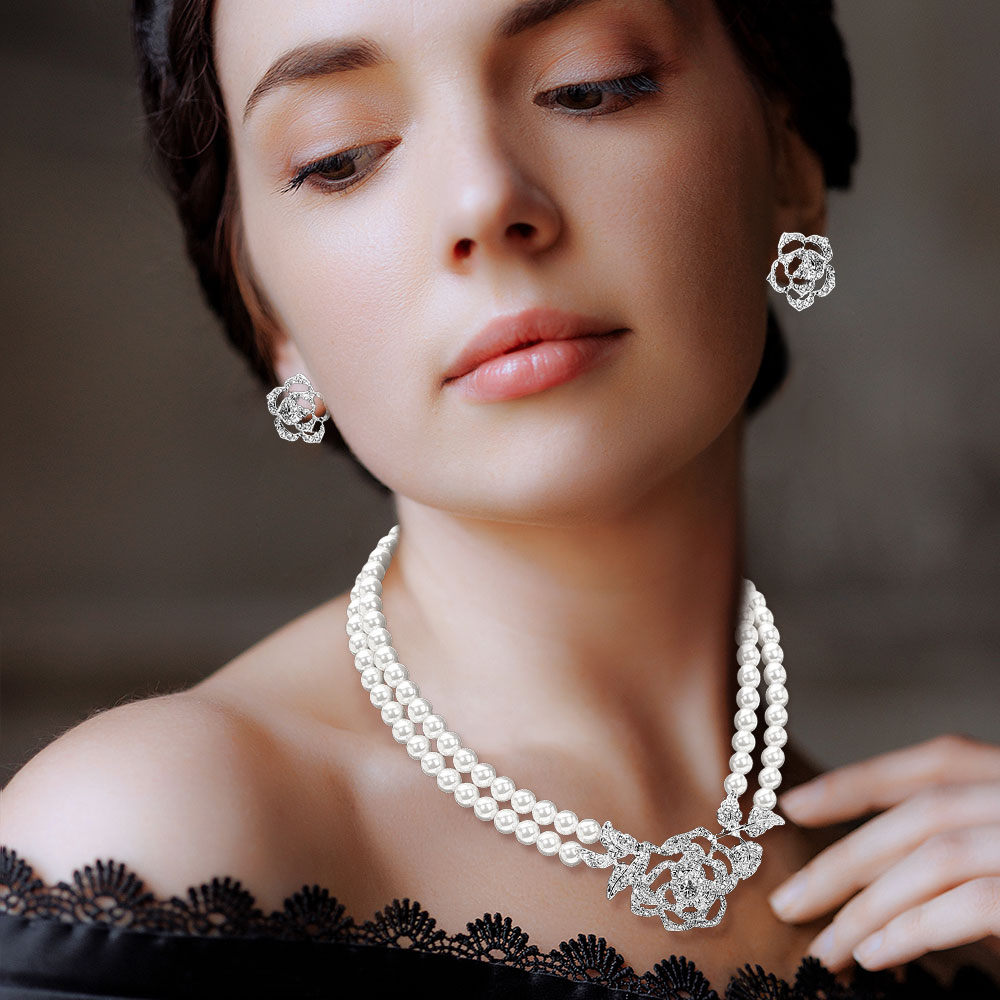 Rhinestone Paved Rose Pendant Double Layered Pearl Necklace