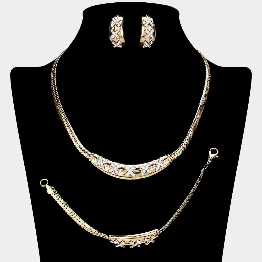 Rhinestone Paved X Pointed Plate Snake Chain Necklace Jewelry Set