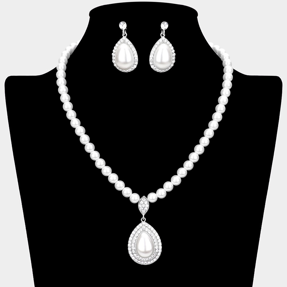 Details • Necklace Size : 16" + 2.5" L • Decor Size : 0.8" X 1.75" • Earring Size : 1.25" L • Enhance your elegance with this teardrop pearl necklace and earring set, beautifully detailed with sparkling crystal accents. Perfect for weddings, formal occasions, and evening events, this timeless jewelry ensemble adds sophistication and a radiant touch to any look.