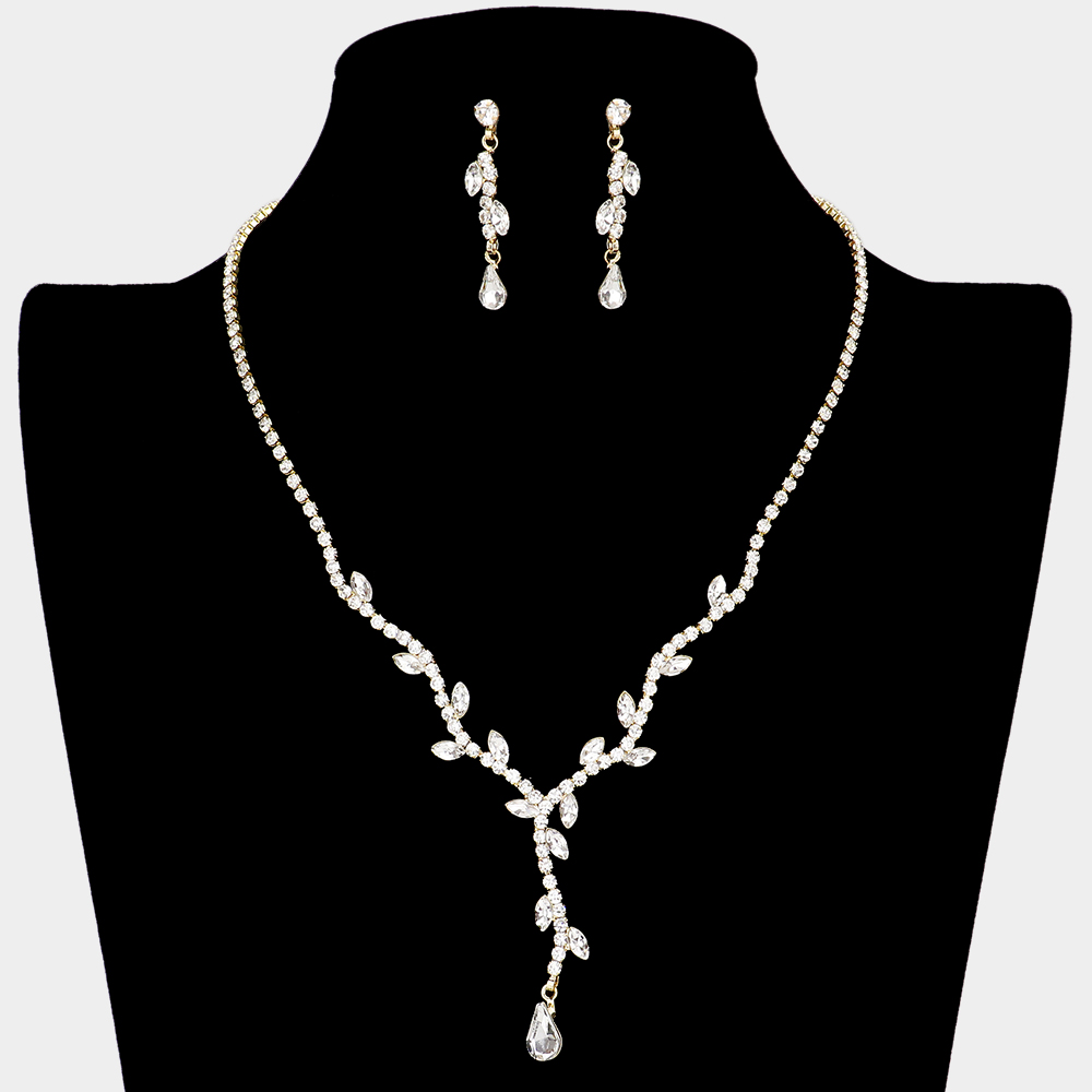 • Elegant necklace and earring set with shimmering leaf-shaped stones and a delicate drop pendant. Perfect for weddings, proms, and special events for a refined and glamorous look.
