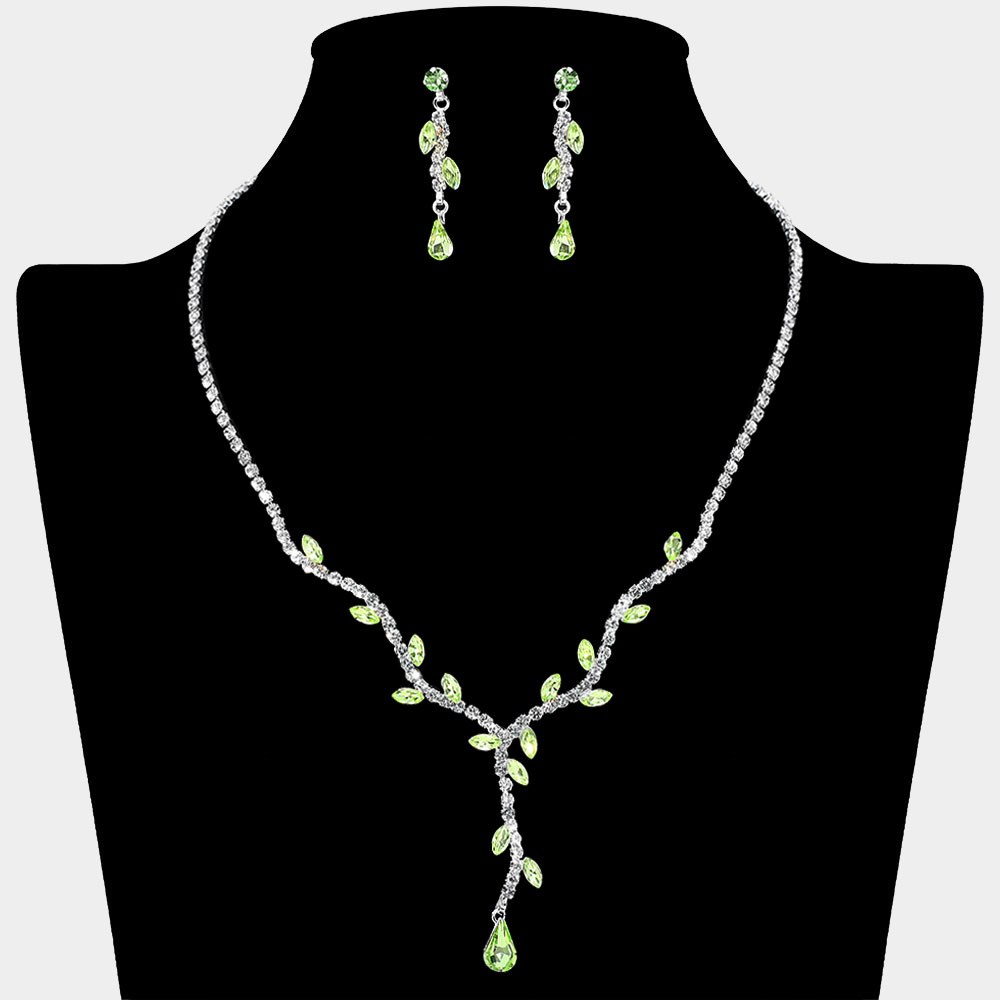 Details • Necklace Size : 16" + 4" L • Decor Size : 1.75" L • Earring Size : 1.5" L • Elegant necklace and earring set with shimmering leaf-shaped stones and a delicate drop pendant. Perfect for weddings, proms, and special events for a refined and glamorous look.