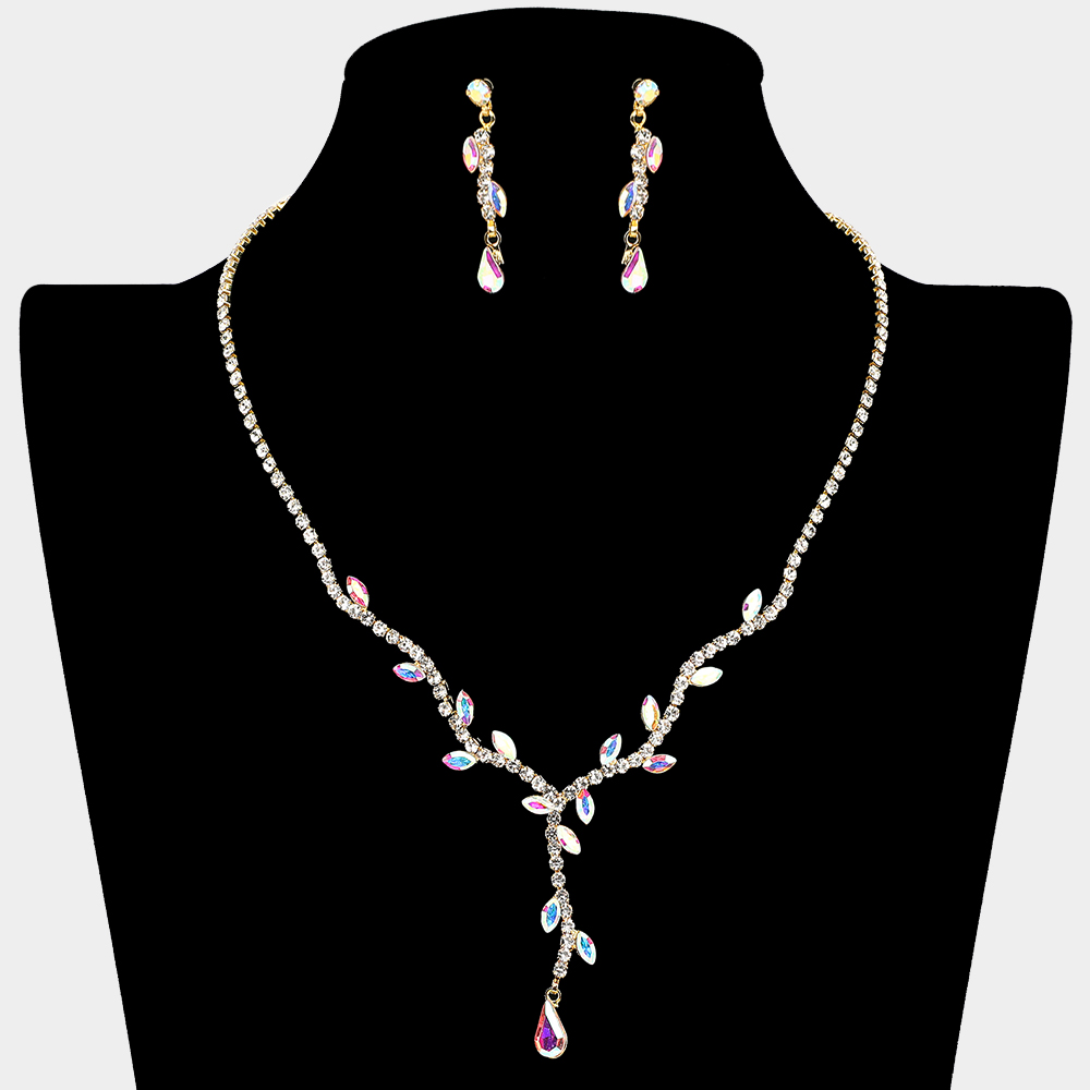 • Elegant necklace and earring set with shimmering leaf-shaped stones and a delicate drop pendant. Perfect for weddings, proms, and special events for a refined and glamorous look.