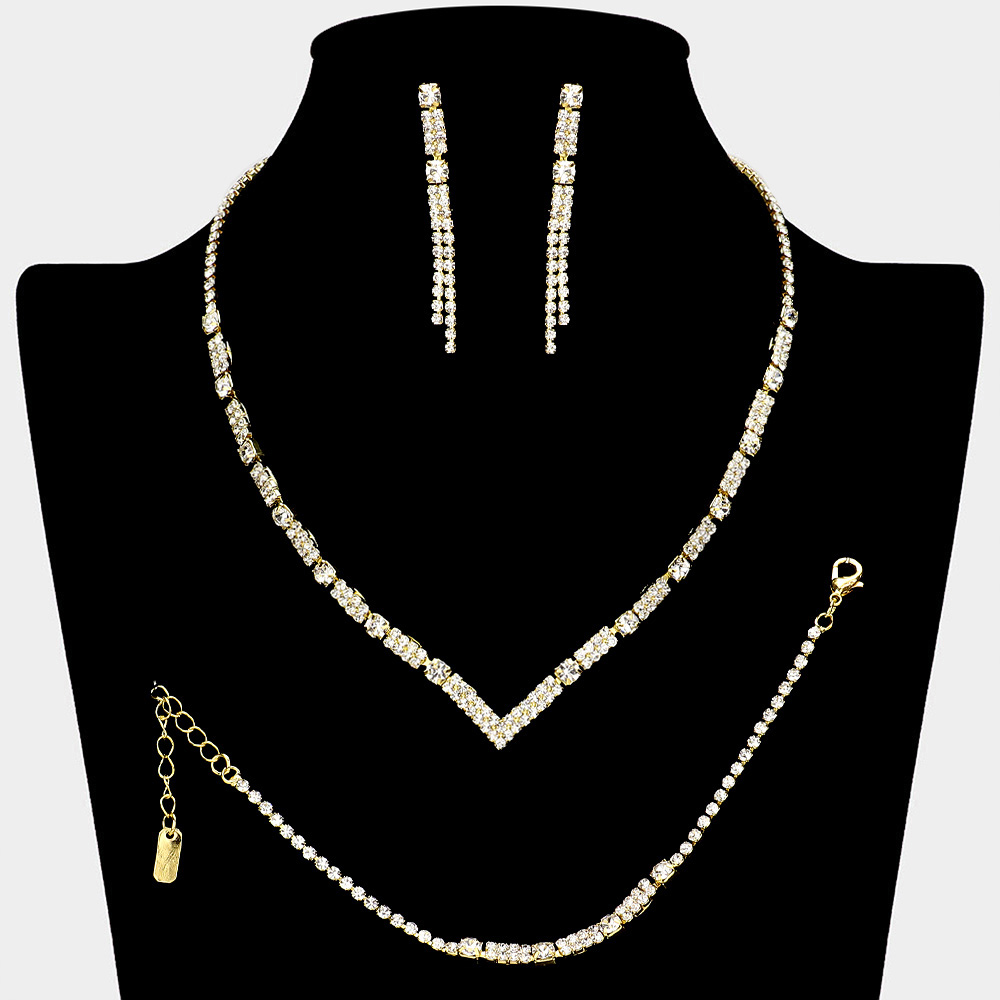 Crystal Rhinestone Pave V Shape Collar Necklace Clip on Earring Set