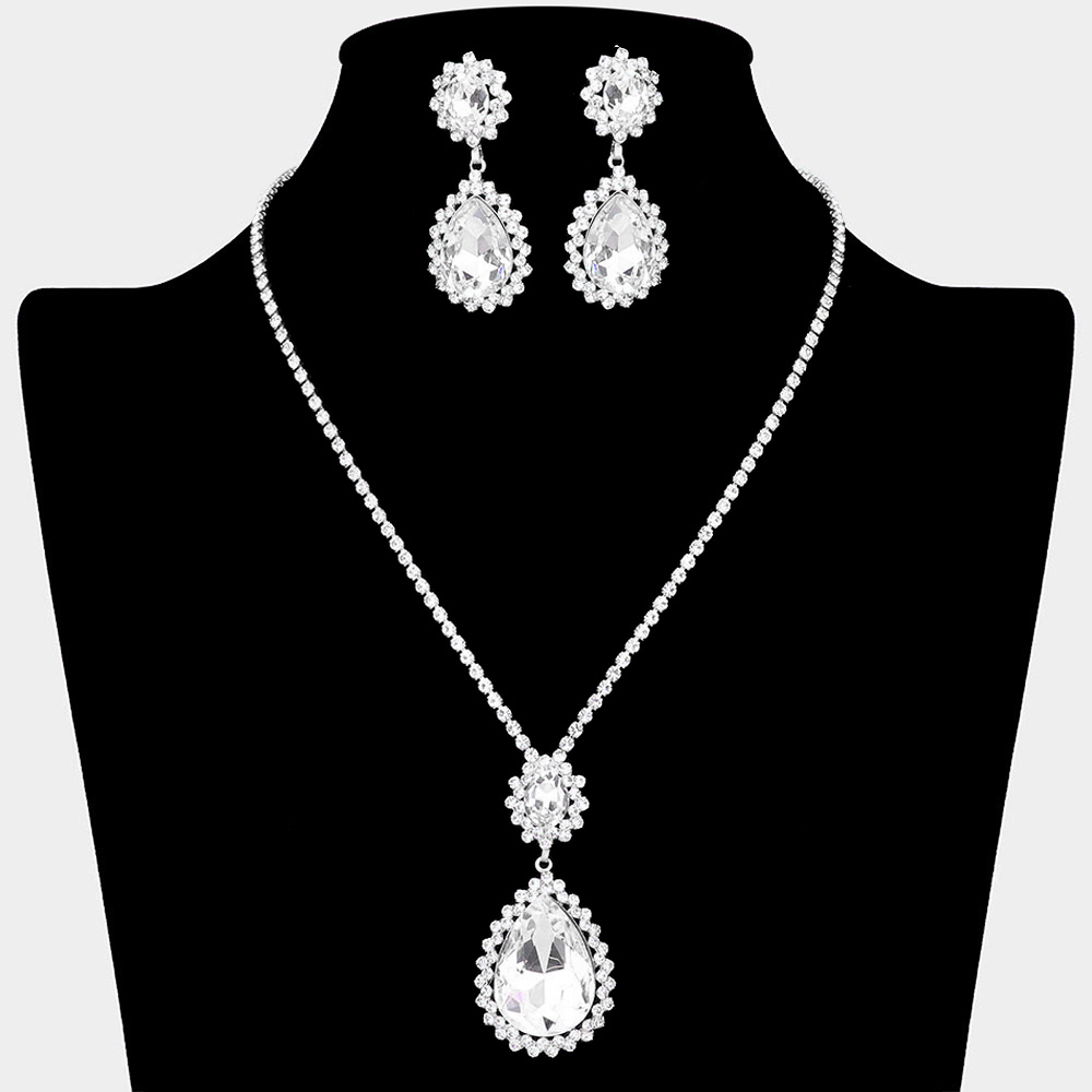Details • Necklace Size : 13" + 4" L • Decor Size : 2" L • Earring Size : 1.75" L • Discover timeless elegance with this teardrop crystal necklace and earring set. Featuring a radiant teardrop centerpiece with matching earrings, it’s the perfect choice for weddings, proms, and special occasions. Add sophistication and sparkle to your evening look.