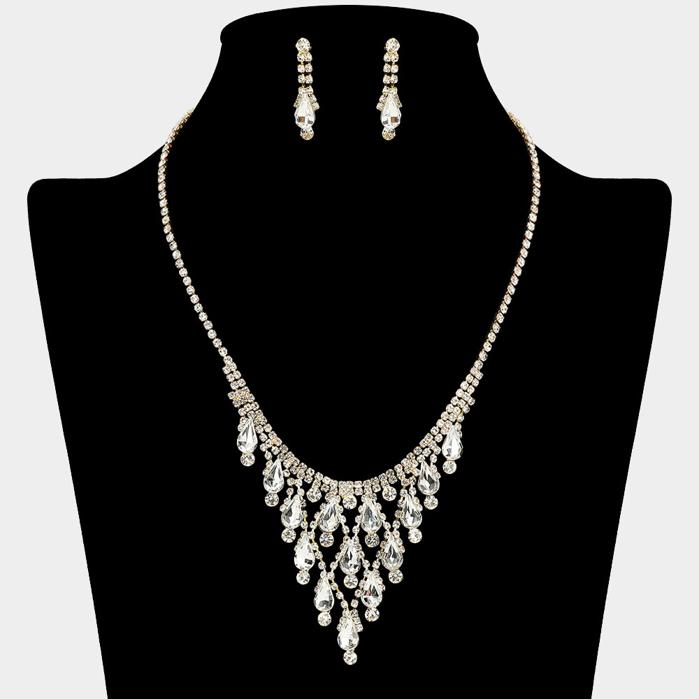• Elegant teardrop crystal necklace and matching earrings with cascading accents and shimmering detail. Ideal for weddings, galas, and formal occasions, this radiant set brings a luxurious touch to any ensemble.