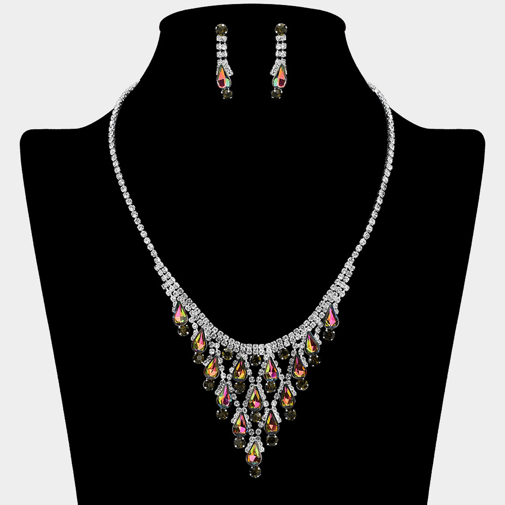 • Elegant teardrop crystal necklace and matching earrings with cascading accents and shimmering detail. Ideal for weddings, galas, and formal occasions, this radiant set brings a luxurious touch to any ensemble.