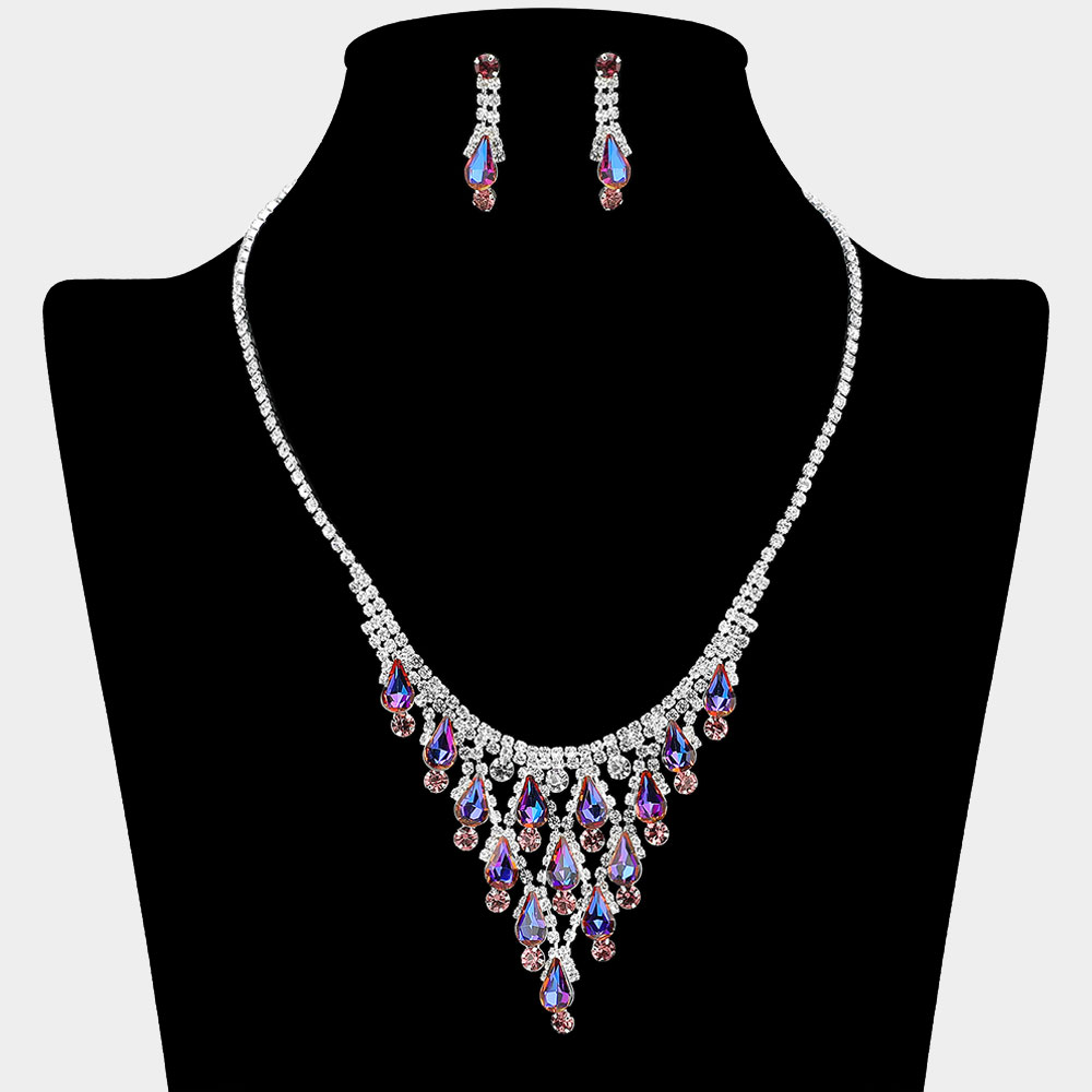 • Elegant teardrop crystal necklace and matching earrings with cascading accents and shimmering detail. Ideal for weddings, galas, and formal occasions, this radiant set brings a luxurious touch to any ensemble.