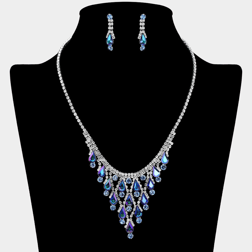 • Elegant teardrop crystal necklace and matching earrings with cascading accents and shimmering detail. Ideal for weddings, galas, and formal occasions, this radiant set brings a luxurious touch to any ensemble.