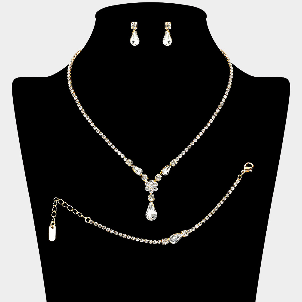 Teardrop Cluster Pendant Flower Pointed Rhinestone Paved Jewelry Set