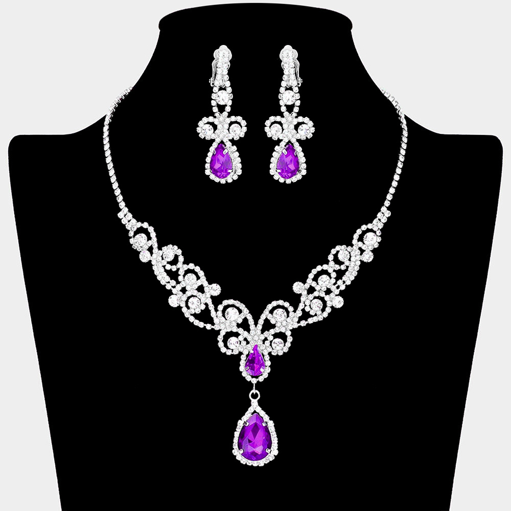 Teardrop Crystal Rhinestone Vine Drop Collar Necklace Clip on Earring Set