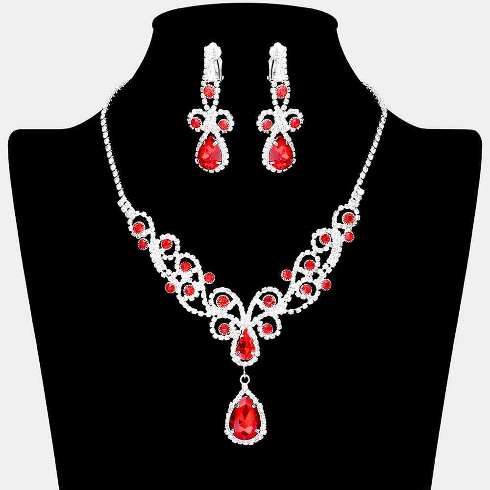 Teardrop Crystal Rhinestone Vine Drop Collar Necklace Clip on Earring Set
