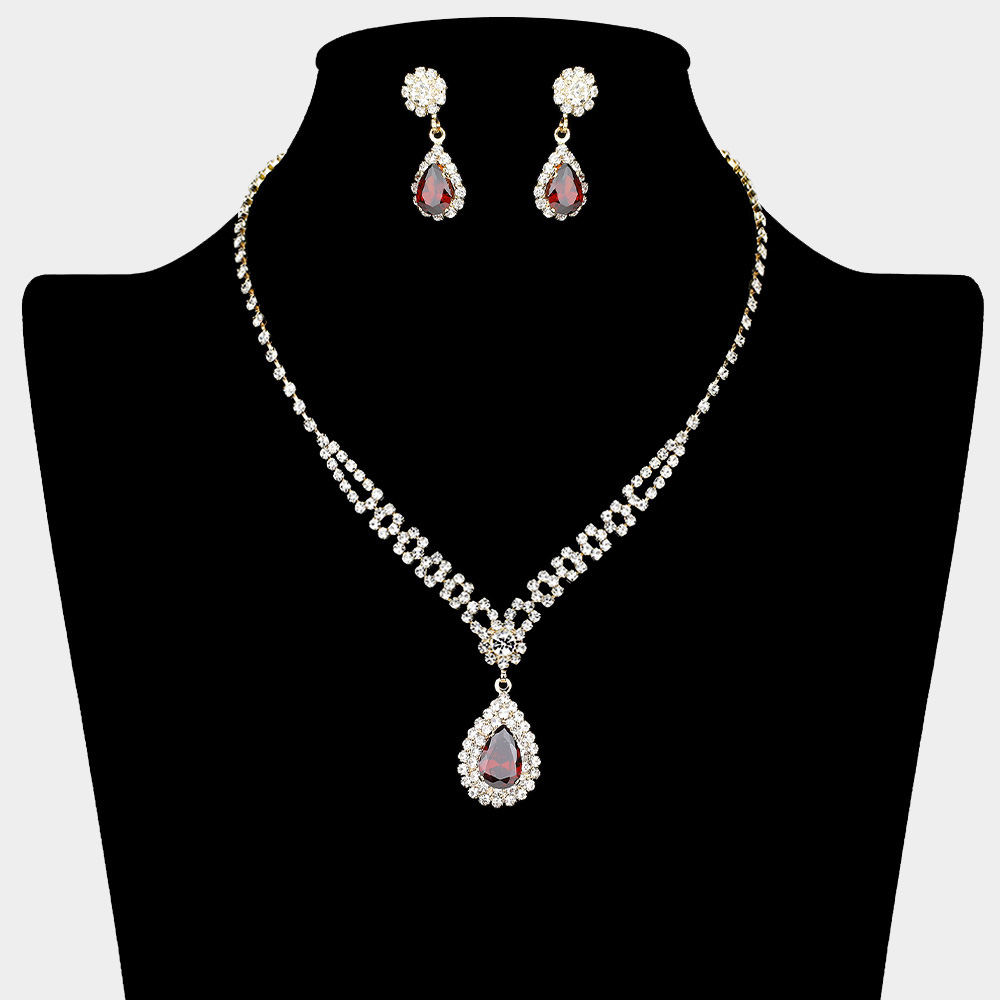 Oval Stone Accented V Shaped Rhinestone Necklace Clip on Earring Set