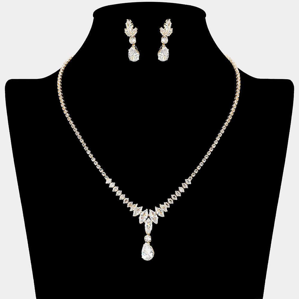 Details • Necklace Size : 17.5" + 4.5" L • Decor Size : 1.4" L • Earrings Size : 1.2" L • Elegant necklace and earring set featuring a teardrop pendant with sparkling accents and matching drop earrings. Perfect for weddings, parties, or evening events, this jewelry set adds timeless sophistication and radiant charm to your look. • CZ Cubic Zirconia