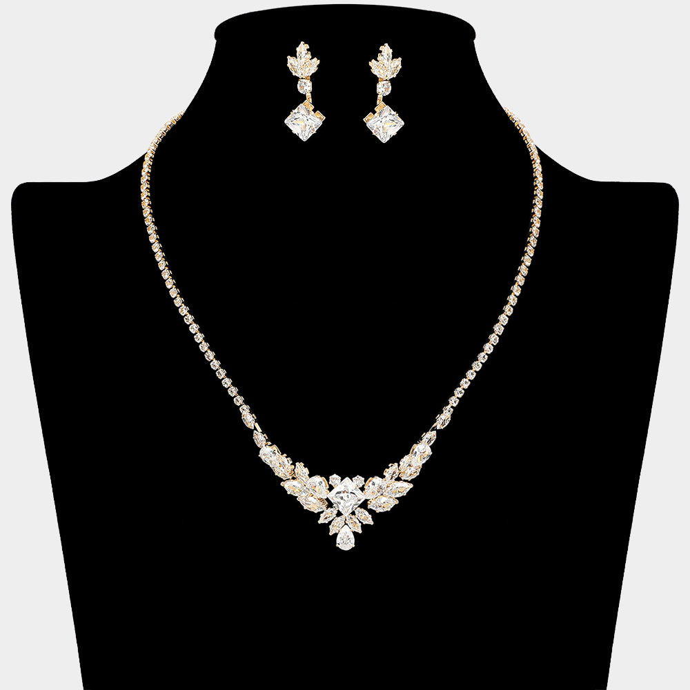 Details • Necklace Size : 16.75" + 4.75" L • Decor Size : 0.75" L • Earrings Size : 1" L • Stunning jewelry set featuring a V-cut necklace with dazzling cubic zirconia stones and matching drop earrings. Designed for elegance, this set adds brilliance and refinement to formal outfits and evening wear. • CZ Cubic Zirconia