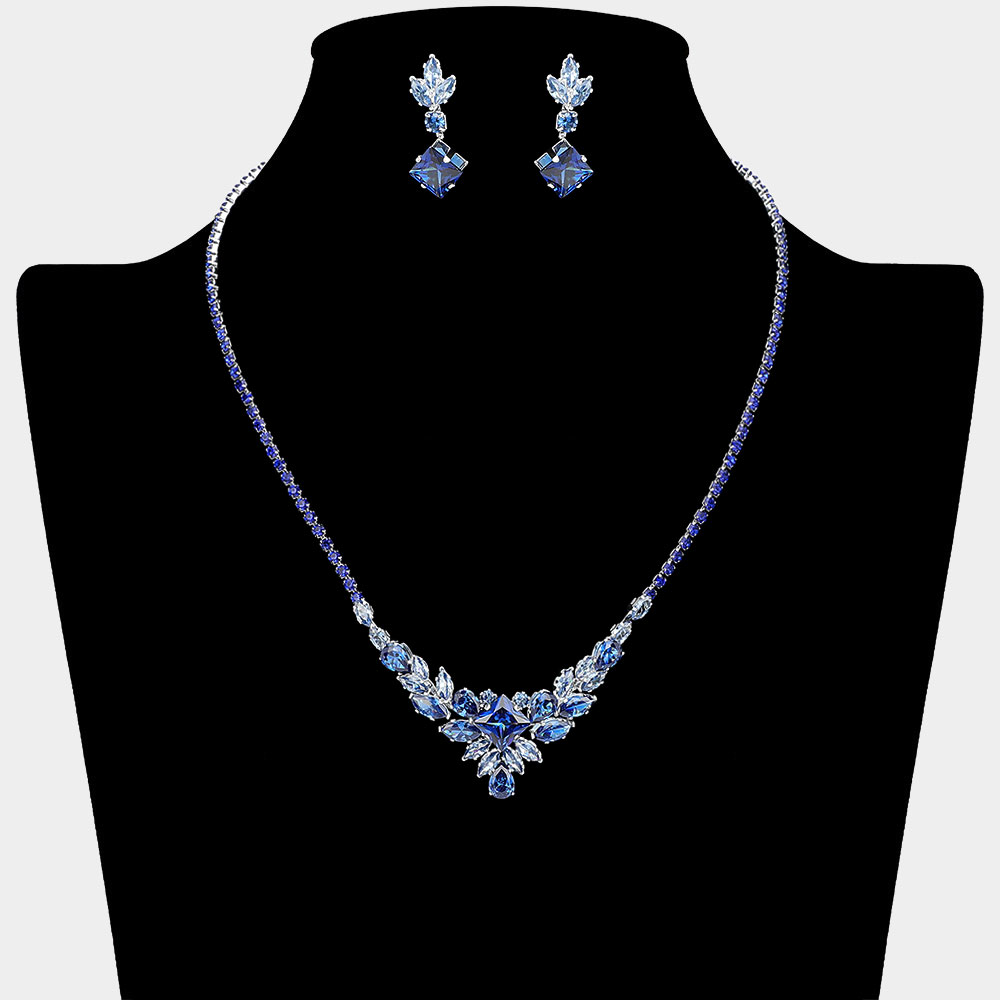 • Stunning jewelry set featuring a V-cut necklace with dazzling cubic zirconia stones and matching drop earrings. Designed for elegance, this set adds brilliance and refinement to formal outfits and evening wear.