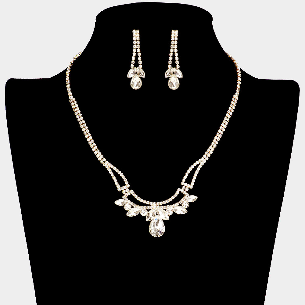 Details • Necklace Size : 15" + 4" L • Decor Size : 0.8" L • Earring Size : 1.4" L • Elevate your look with this rhinestone teardrop necklace and matching earrings set. Featuring shimmering accents and a delicate drop design, this jewelry set is perfect for weddings, proms, and elegant occasions, adding a dazzling touch of sparkle to complete your special event outfit. • Lead and Nickel Compliant