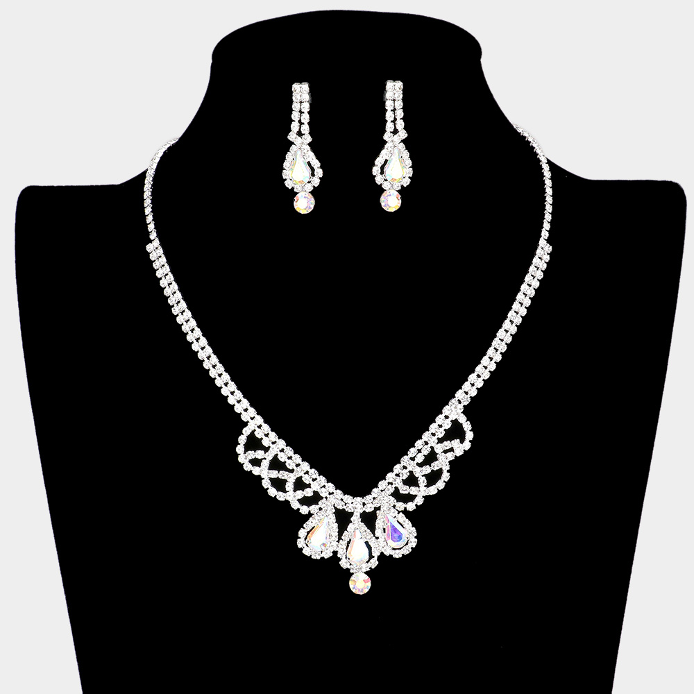 Details • Necklace Size : 15" L + 4" L • Decor Size : 1" L • Earring Size : 1.4" L • Complete your look with this elegant rhinestone teardrop necklace and earrings set. Featuring cascading teardrop pendants with sparkling accents, this timeless jewelry is ideal for weddings, proms, galas, or evening events, adding refined charm and brilliance to your special occasion style. • Lead and Nickel Compliant