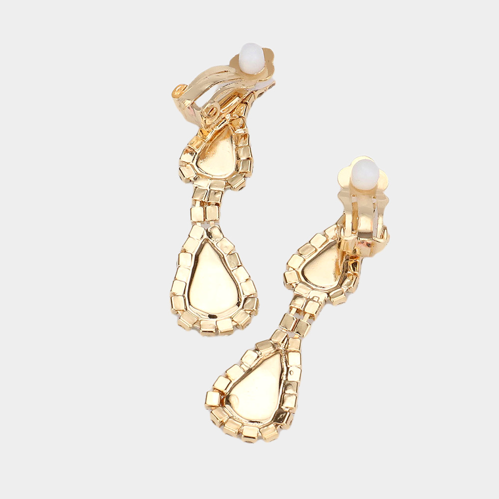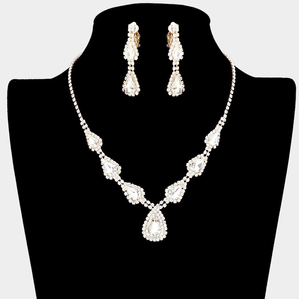 Teardrop Stone Accented Rhinestone Pave Necklace Clip on Earring Set