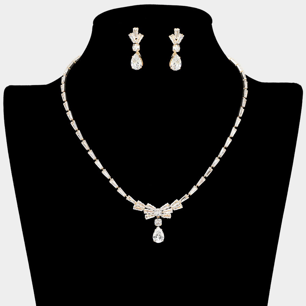 Teardrop Stone Cluster Dangle Bow Baguette CZ Stone Cluster Embellished Necklace